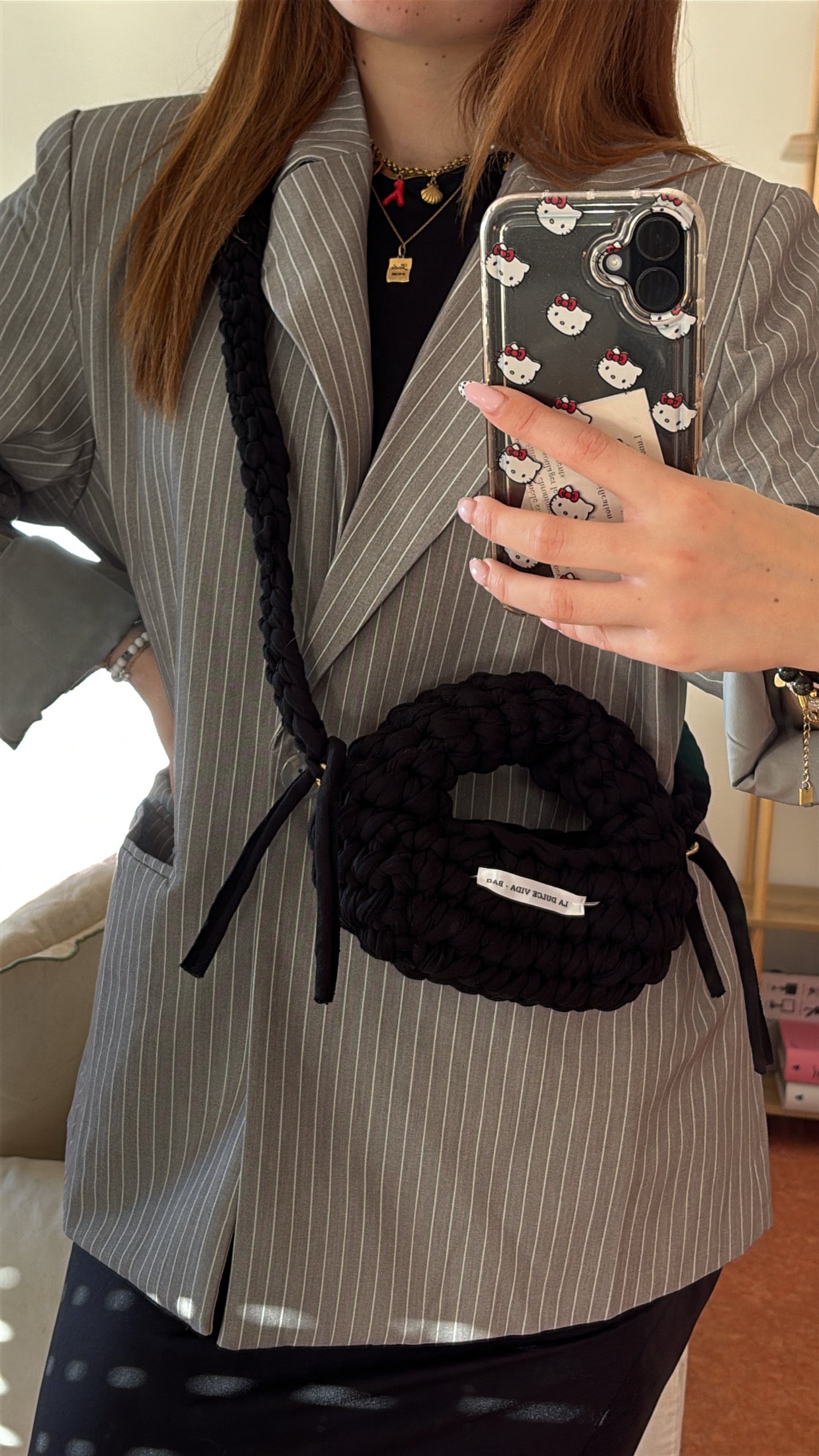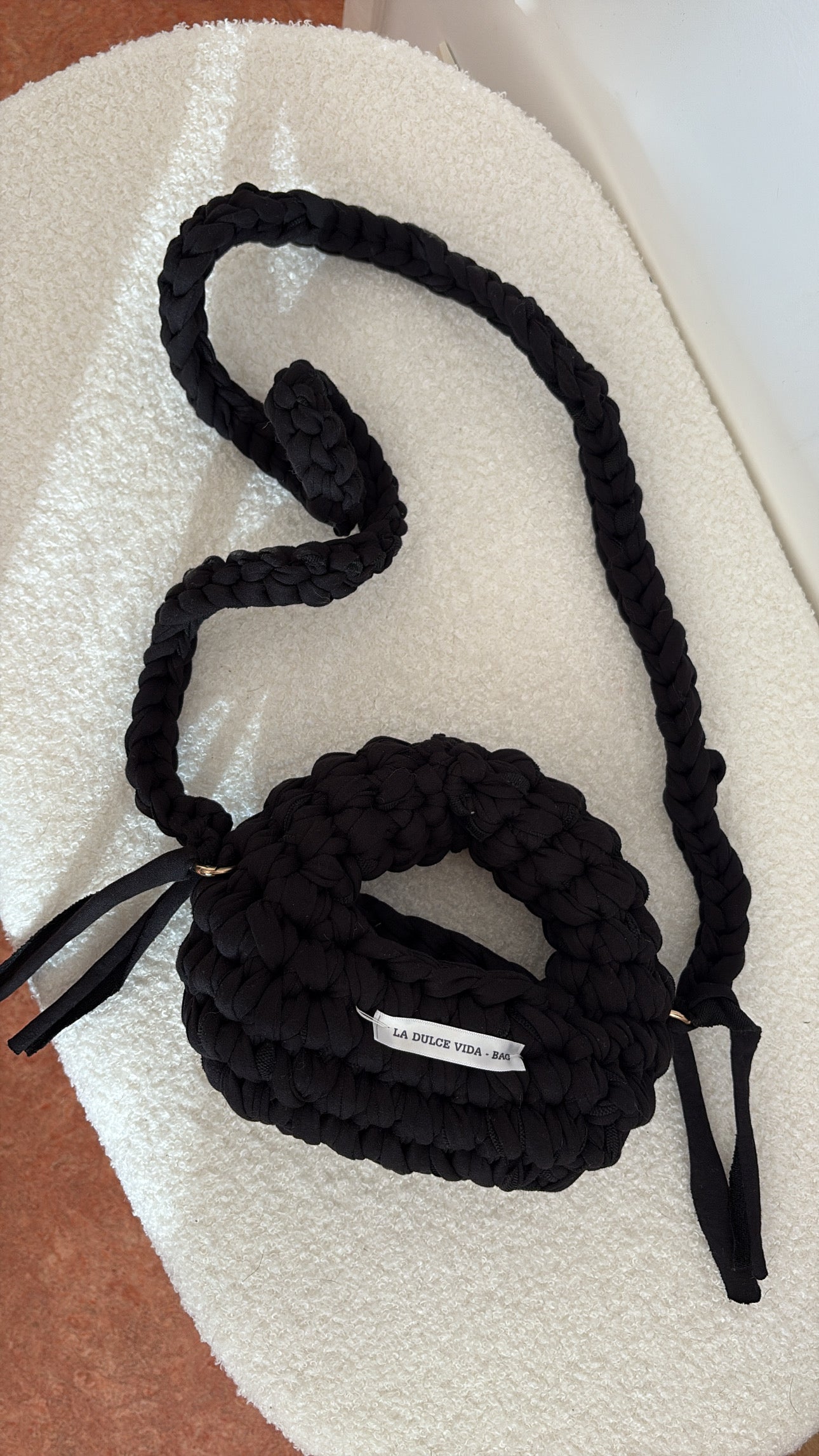 Élégant, minimaliste et éco-responsable, ce mini sac noir est l’allié parfait pour vos sorties. Entièrement crocheté à la main à partir de fil t-shirt recyclé, il allie design artisanal et conscience écologique.