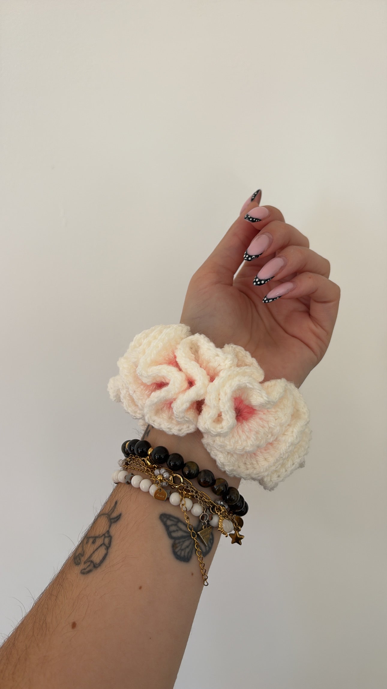 Apportez une touche de douceur et d’élégance à vos coiffures avec ce chouchou crocheté à la main. Réalisé avec soin à partir de fil doux, il se distingue par ses jolies nuances crème et rosées qui évoquent la délicatesse d’un pétale de fleur.