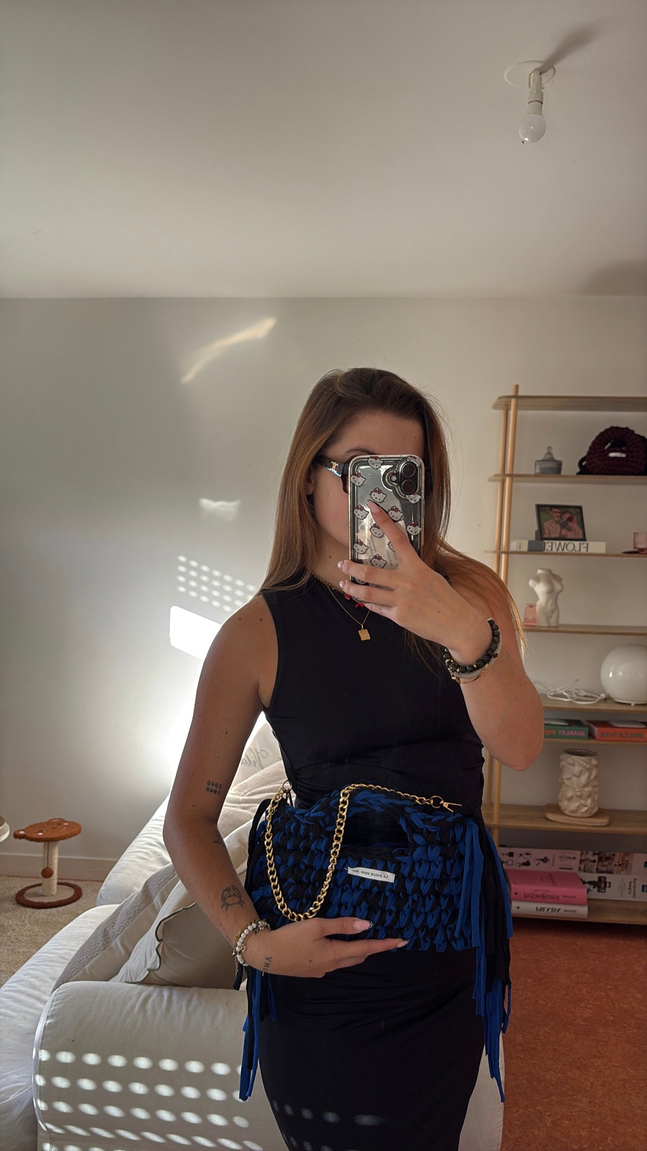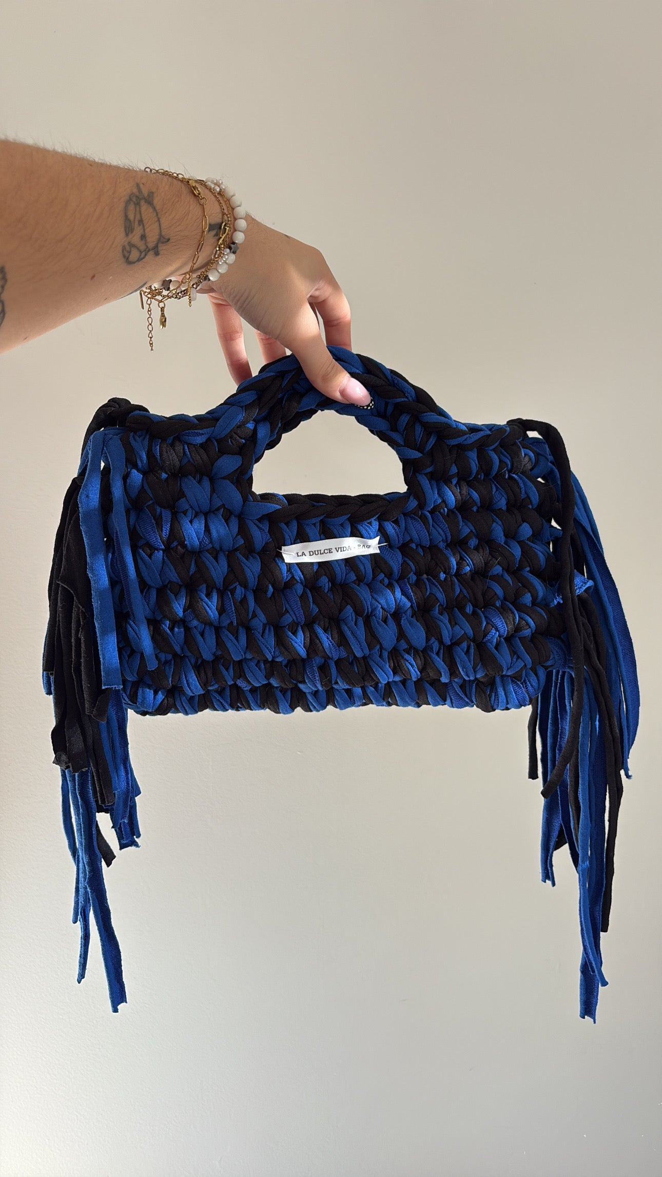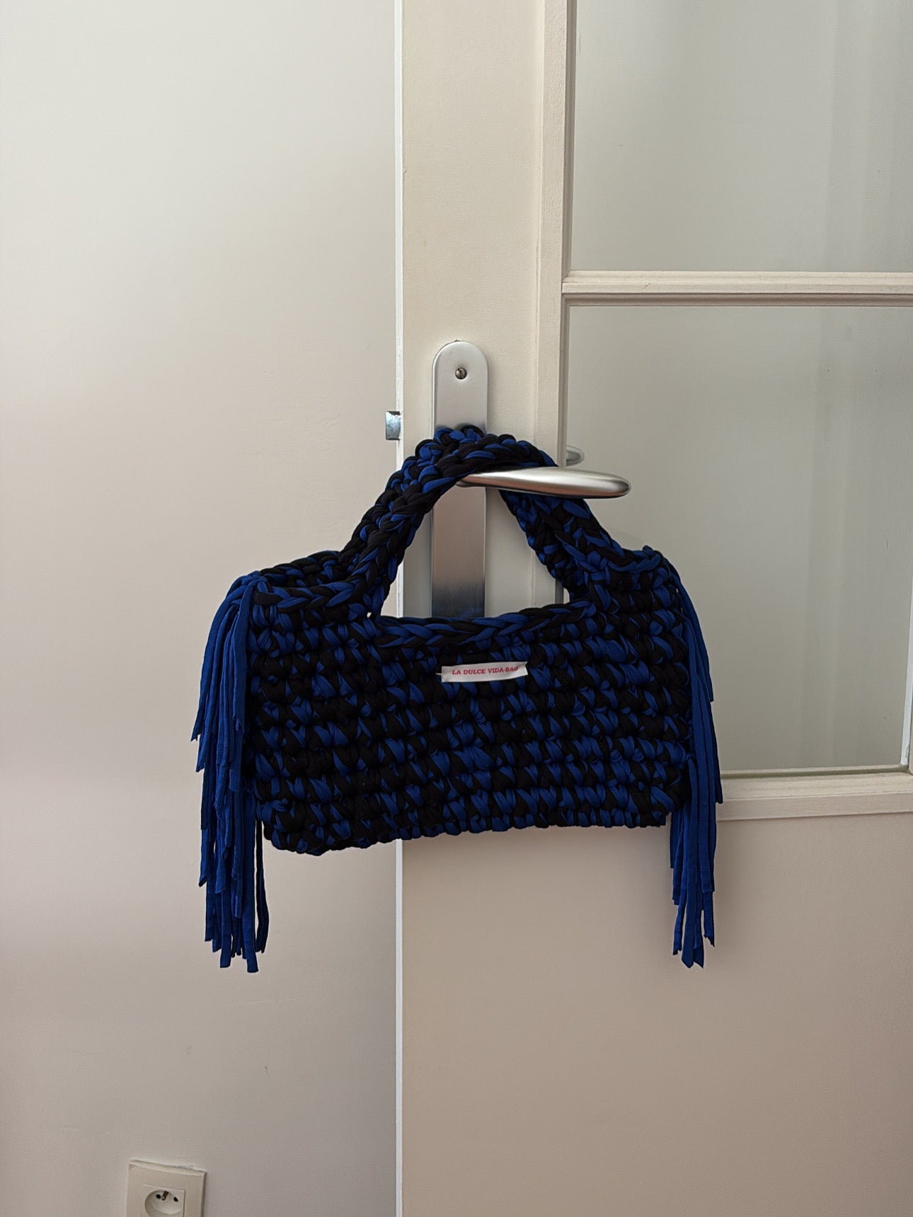 Audacieux et éthique, ce sac crochet bicolore est une véritable pièce de caractère. Réalisé à la main à partir de fil t-shirt recyclé, il combine le noir profond et le bleu électrique dans un tressage épais et graphique. Ses poignées intégrées et ses franges latérales lui confèrent une allure à la fois moderne et artisanale.