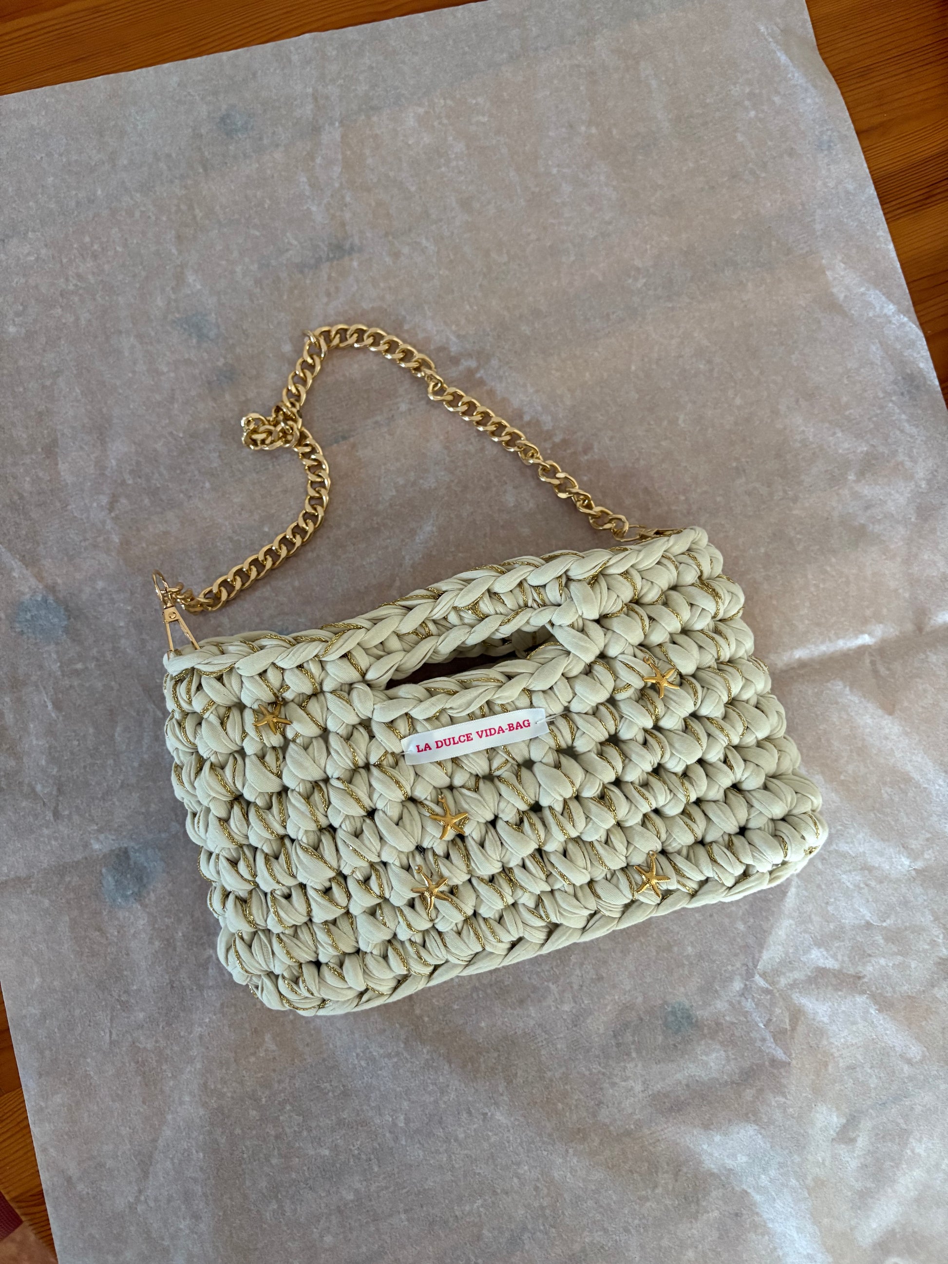 Ses détails délicats, comme les petites étoiles dorées incrustées, lui confèrent un charme raffiné et estival. Compact mais suffisamment spacieux, il est idéal pour transporter vos essentiels au quotidien ou lors de vos sorties estivales.