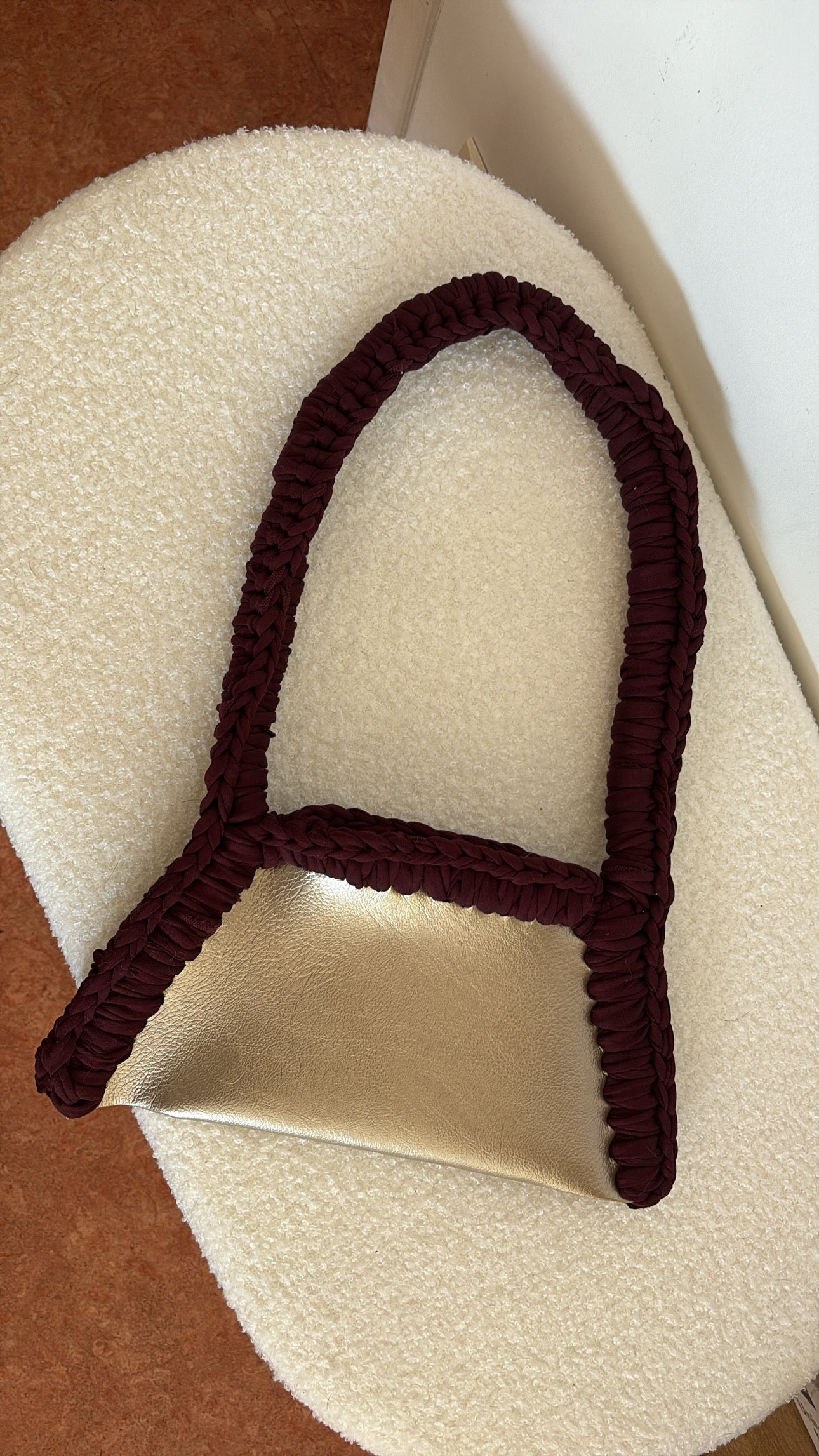Le Sac “ Doré ” associe une base dorée lumineuse à une bordure et une anse tressées dans un fil de T-shirt bordeaux 100 % recyclé. Ce contraste subtil entre le brillant du doré et la profondeur du bordeaux crée un équilibre parfait entre sophistication et durabilité.